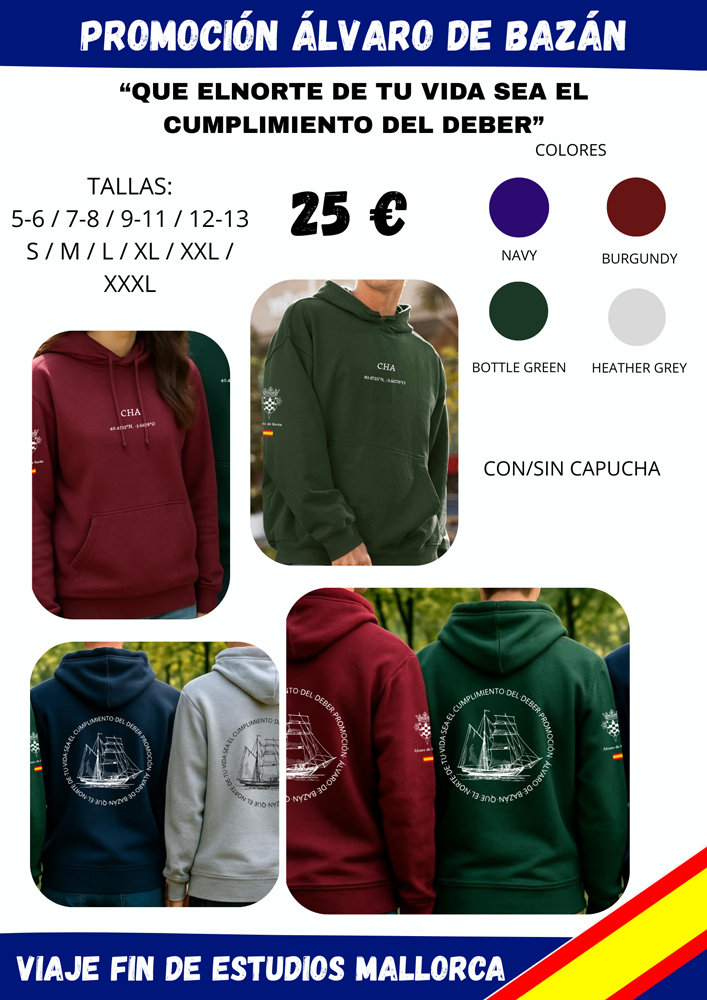 Los alumnos de 2º de Bachillerato de la Promoción Álvaro de Bazán, a fin de recaudar fondos para su próximo viaje de fin de estudios 2026, ponen a la venta sudaderas con/sin capucha diseño edición limitada "QUE EL NORTE DE TU VIDA SEA EL CUMPLIMIENTO DEL DEBER"/BANDERA DE ESPAÑA (todas las tallas disponibles), al precio de 25 euros