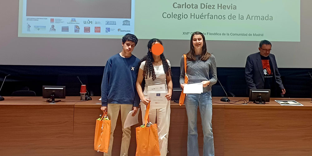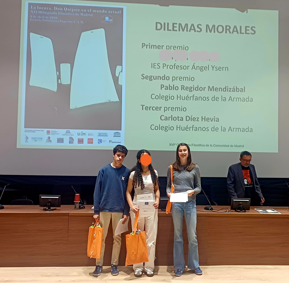 Los alumnos de 4.º de la ESO, Pablo Regidor Mendizábal y Carlota Díez Hevia, preparados por la profesora de Filosofía, Doña Lourdes García del Portillo, han resultado ganadores con el 2.° y 3.° puesto, respectivamente, en la categoría de Dilema moral de la XVI Olimpiada Filosófica de Madrid.