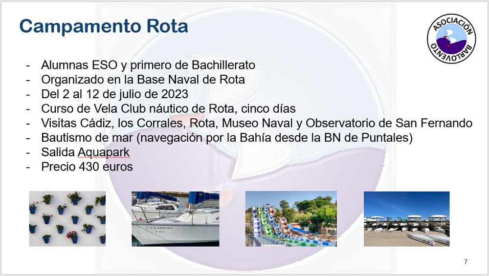 - martes 11 de julio 2023 Visita guiada al Castillo de Luna en Rota sede actual del Ayuntamiento. Visita a la fragata Reina Sofía en la Base Naval de Rota. Fiesta de disfraces de despedida. Entrega de trofeos