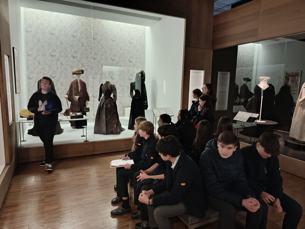 El guía ha fomentado la participación activa y el descubrimiento con el objetivo de que los estudiantes no solo adquieran conocimientos sobre la historia del traje en España, sino que también sientan curiosidad por ampliarlos y conectarlos con su vida cotidiana.
