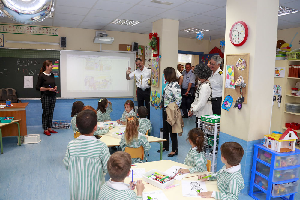 Tras ver el laboratorio de biología, el gimnasio y otras instalaciones, Robles se ha trasladado a las aulas de los más pequeños, los alumnos de infantil y primaria. Con ellos ha charlado sobre sus clases y las profesiones de sus padres, entre otros temas. En una de las clases le han regalado un álbum de dibujos elaborados por los más pequeños sobre ella y su visión de las Fuerzas Armadas.
