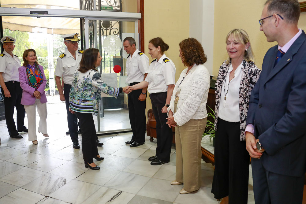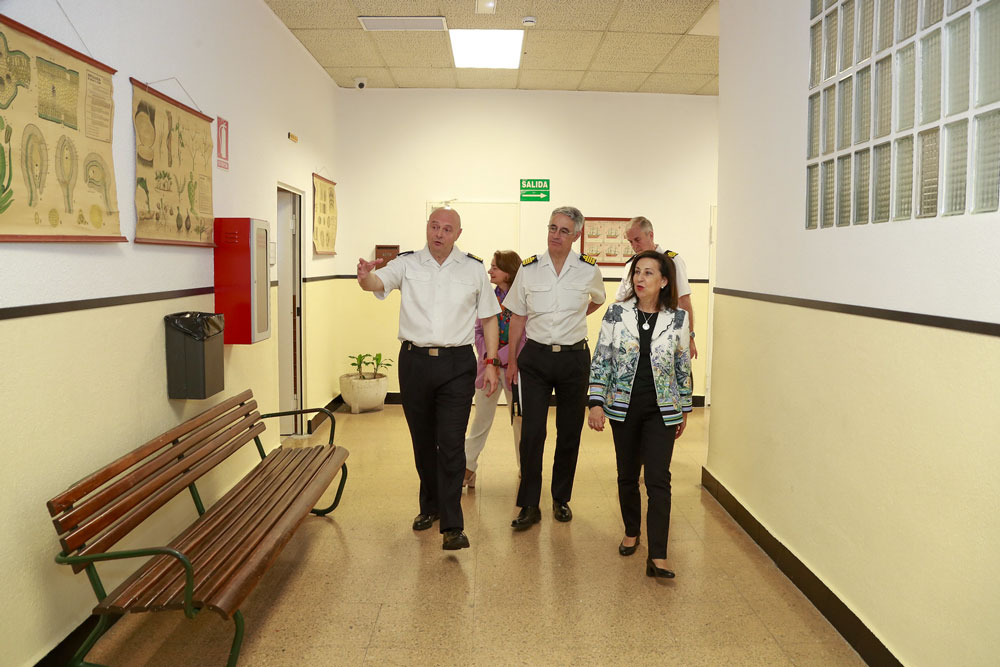 La ministra ha sido recibida a su llegada al colegio por el presidente del Patronato de la Armada, vicealmirante Alfonso Fernández de Córdoba, y por el director interino, capitán de fragata Francisco José Gª Sánchez, que ha ofrecido una presentación de la institución educativa privada centenaria en la que actualmente cursan estudios desde infantil a bachillerato un total de 598 alumnos.