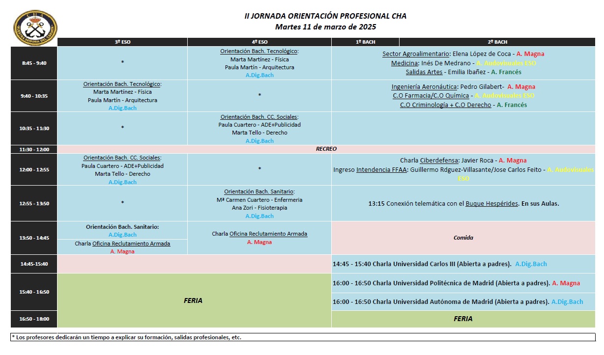 El pasado martes 11 de marzo se celebró la II Jornada de Orientación Profesional del CHA. Durante esta jornada los alumnos recibieron información por parte de profesionales de diversos sectores profesionales, muchos de ellos antiguos alumnos de nuestro Colegio, a los que estamos muy agradecidos.