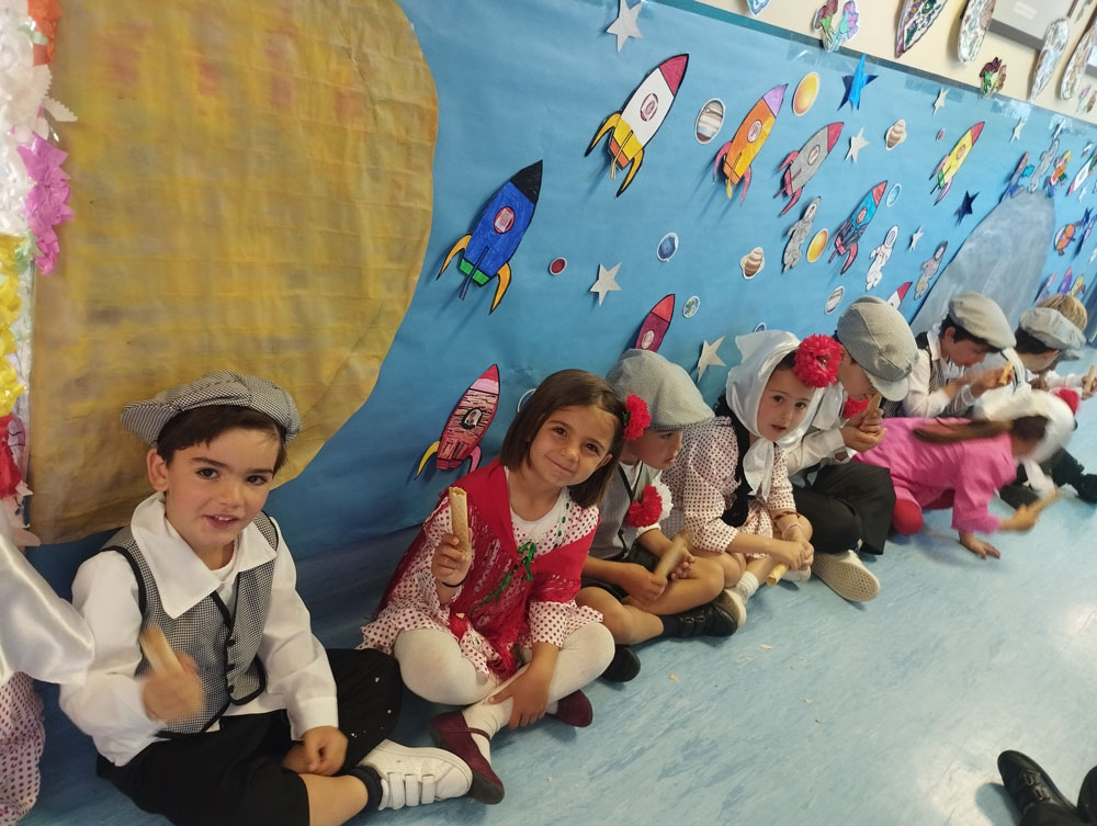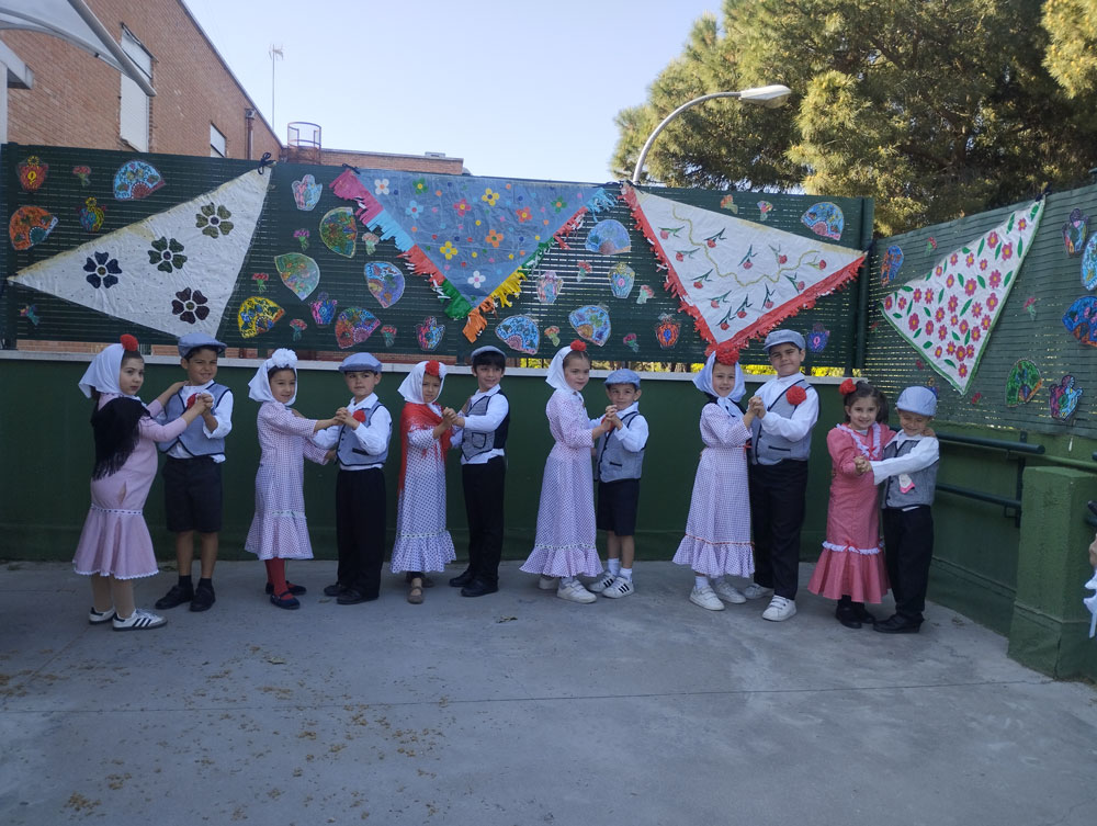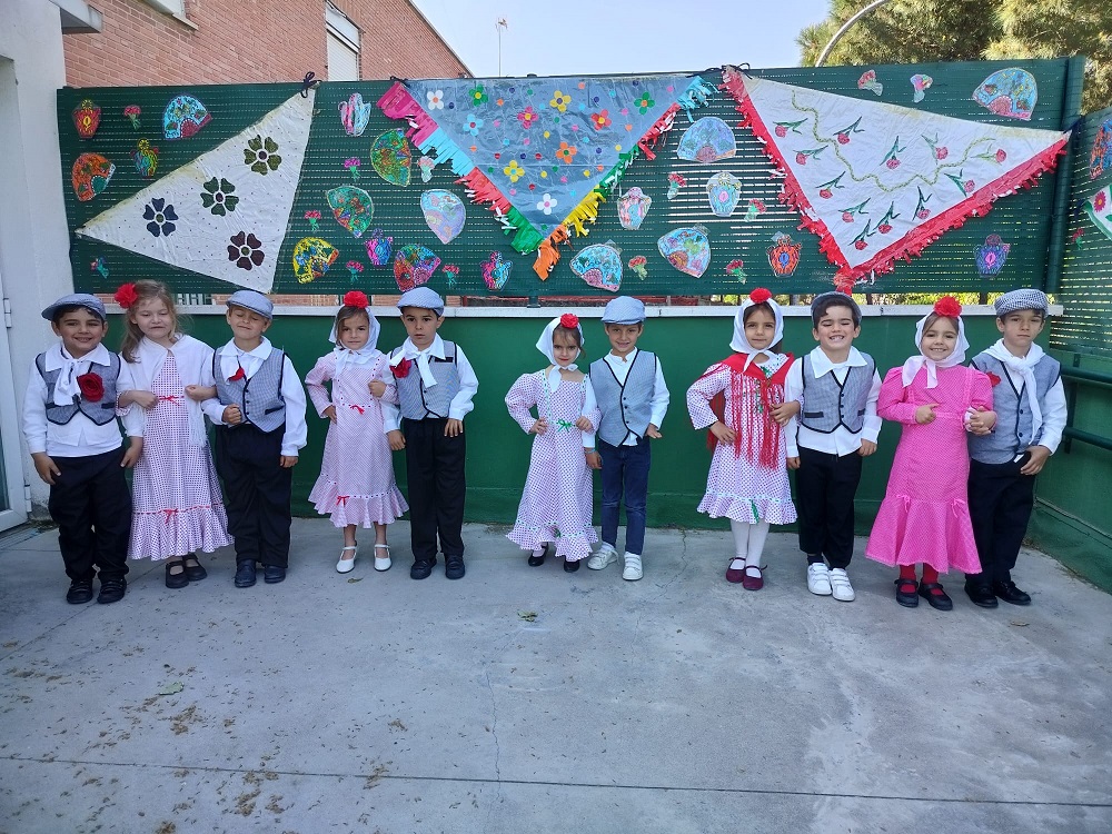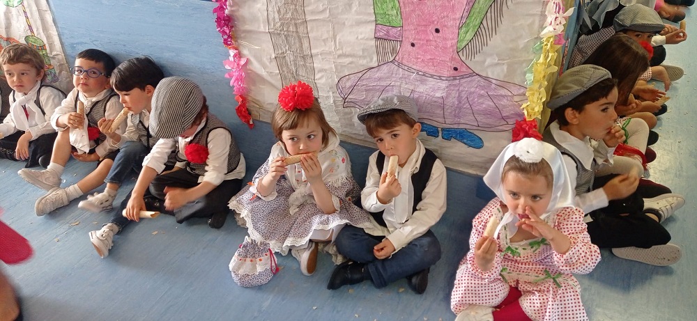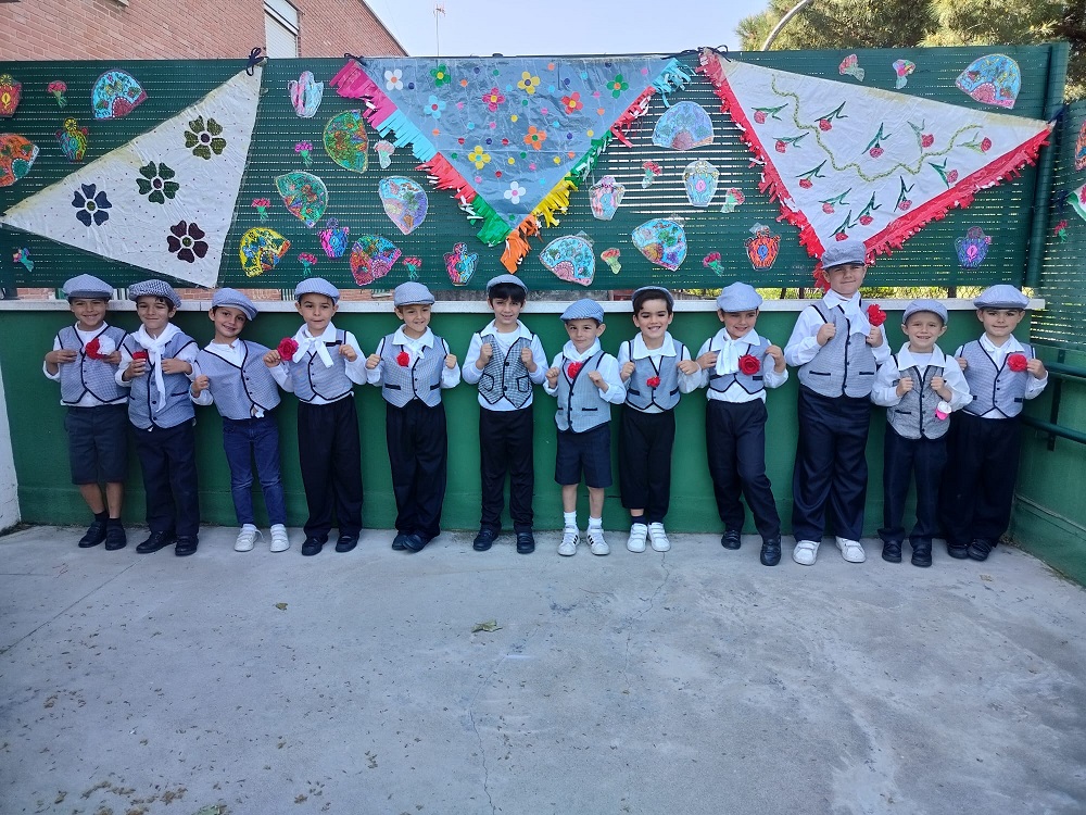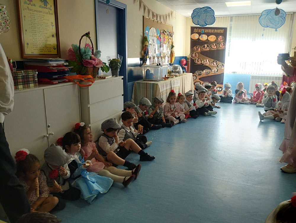 Los niños y los profes nos disfrazamos de chulapos y chulapas, realizamos talleres de manualidades, tomamos barquillos del Santo, rosquillas de limón, hicimos fotos, bailamos el chotis y terminamos la jornada con “discobaby” en el patio.